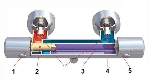 Przykładowy schemat zasady działania baterii termostatycznej: