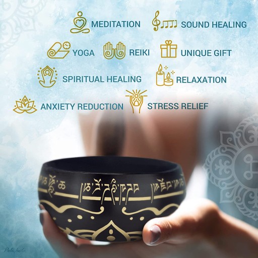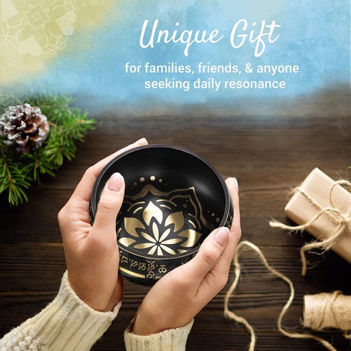 Tibetan Singing Bowl Set ~ Easy to Play with New Dual-End Striker & Cushion ~ Creates Beautiful Sound for Healing, Stress Relief, Meditation & Relaxation ~ Bliss Pattern ~ Black Bowl with Black Pillow
