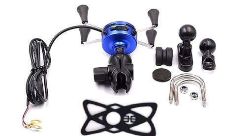 - Uchwyt typu X z 4 ramionami zakończonymi gumowymi chwytakami, ładowarką USB, włącznikiem i kablem