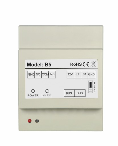 B5 to specjalny moduł przeznaczony do pracy w systemie VIDOS DUO. Posiada funkcję rozszerzenia funkcjonalność systemu o możliwość obsługi drugiego rygla/bramy lub sterowanie oświetleniem. Moduł umożliwia również obsługę rygli wysokoprądowych oraz otwieranie wejścia przy użyciu dodatkowego przycisku zwiernego NO przy wyjściu z posesji.