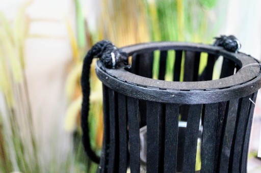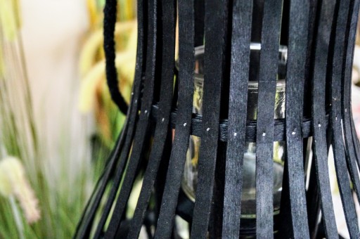 Czarny lampion wykonany z cienkich drewnianych pasków.