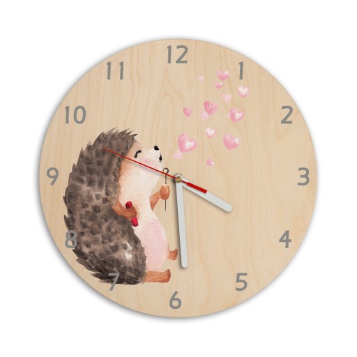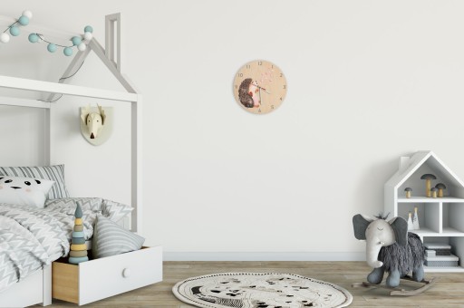 Zegar z nadrukowaną grafiką jeża będzie pięknym dodatkiem do pokoju małej dziewczynki lub chłopca.