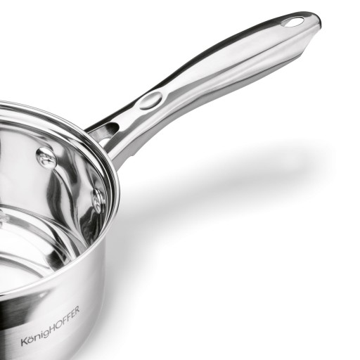 - Zarówno rączka patelni, jak i uchwyty garnków oraz pokrywek są nitowane i solidne, ponieważ wykonano je ze stali szlachetnej