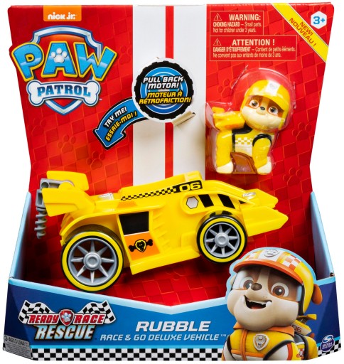 Autko jest w kolorze żółtym i posiada ruchome koła. Dzięki nim oraz napędowi naciągu (pull&release) porusza się po powierzchniach płaskich, pędząc siłą własnego silnika. Wydaje przy tym dźwięki samochodów wyścigowych, takie jak odgłos silnika i pisk opon! W środku znajduje się kolekcjonerska figurka Rubble'a w stroju rajdowca z kaskiem. Jest to wesoły piesek rasy buldog angielski, który w bajce jest konstruktorem i budowniczym.