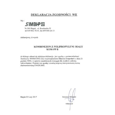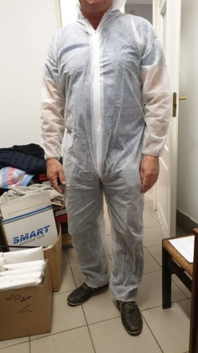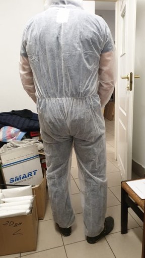 Biały kombinezon jednorazowy jest wykonany z polipropylenu, posiada kaptur oraz gumowe ściągacze na rękawach i nogawkach. Kombinezon chroni przed większym zabrudzeniem w pomieszczeniach suchych oraz przed cząsteczkami stałymi i drobny.