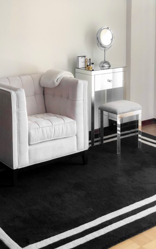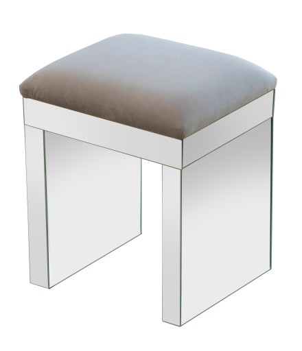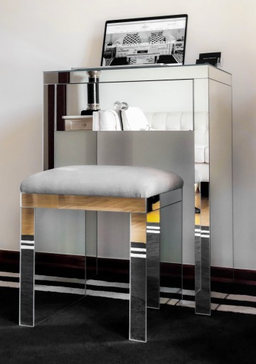 Siedzisko ma kształt prostokąta, i mimo niewielkich rozmiarów, jest bardzo efektowne. Rama siedziska jest lustrzana, osadzona na czterech nogach także wykończonych lustrem kryształowym w kolekcji MANHATTAN. W kolekcji LONG ISLAND nogi siedziska są pełne przez całą głębokość siedziska, a w kolekcji BROOKLYN wykończone stelażem chrom profil 4,5 cm x 4,5 cm. Głębokość siedziska jest taka sama jak toaletki: 35 cm, co jest atutem tego mebla, ponieważ może zostać wsunięty pod toaletkę i zupełnie nie przeszkadzać w pomieszczeniu.
