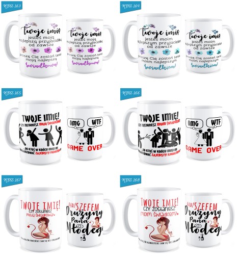 2. W wiadomości do sprzedającego napisz nam numery wzorów (znajdują się powyżej każdej z prezentowanych grafik) kubków jakie chcesz otrzymać. Koniecznie napisz również jakie imię mamy umieścić w miejscu do tego przeznaczonym (imię/pseudonim podaj w takiej odmianie w jakiej chcesz aby znalazło się na kubku).