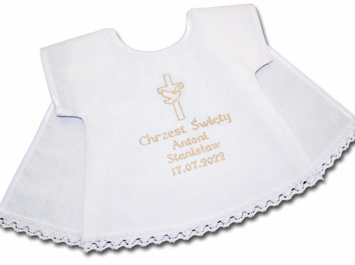 Haft na szatce zostanie wykonany wg Twojego zamówienia, to Ty decydujesz jak ma wyglądać wyjątkowa pamiątka z dnia przyjęcia Chrztu Świętego przez Twoje dziecko, chrześniaka, chrześnicę wybierając parametry zaprezentowane na stronie oferty.