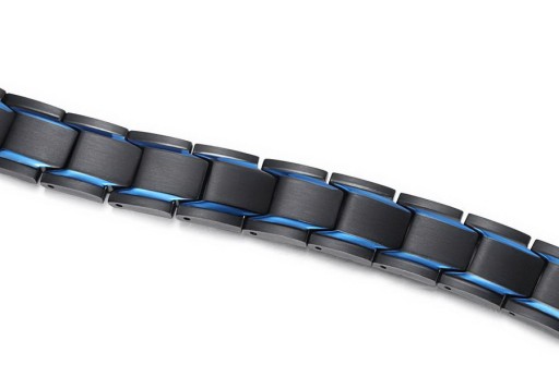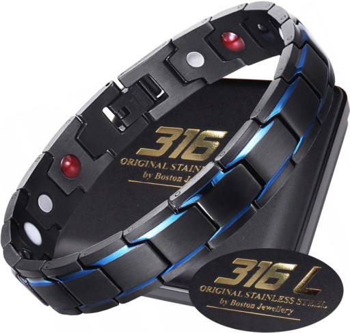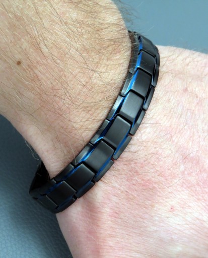 W tej ofercie prezentujemy wyjątkowo elegancki model męski bransolety magnetycznej, który wykonany jest z NAJWYŻSZEJ JAKOŚCI STALI CHIRURGICZNEJ 316L anodowanej na czarno oraz przepiękny kolor - NIEBIESKI KSIĘŻYCOWY. Model ten wyróżnia bardzo eleganckie połączenie elementów złotych i srebrnych. Taki układ bardzo efektownie się prezentuje na dłoni i robi niesamowite wrażenie !!! Jest to jeden z najciekawszych i najlepiej sprzedających się modeli w ostatnim czasie !
