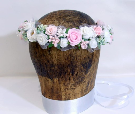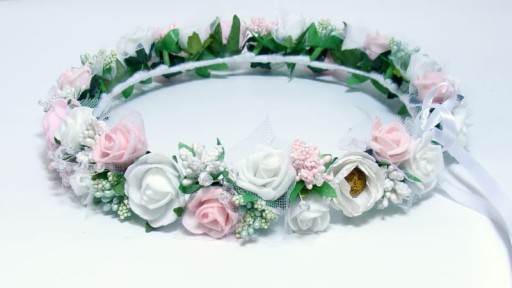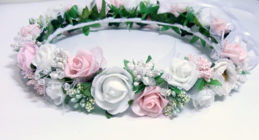 Wianek spleciony z białych i różowych różyczek piankowych, ozdobiony białymi, różowymi i zielonymi szyszeczkami. Dodatkowo zdobiony dużą ilością kryształków na srebrnym druciku.