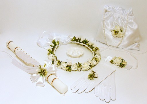 Zestaw komunijny w tonacji biało-zielonej składający się z: