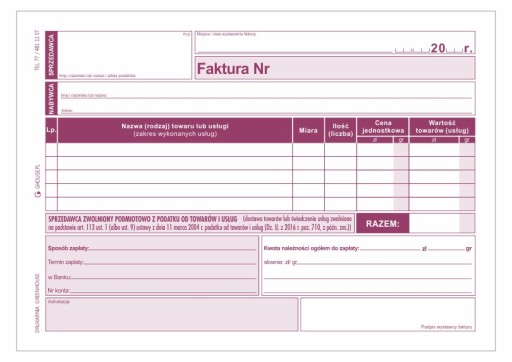 FAKTURA BEZ VAT DLA ZWOLNIONYCH Z PODATKU WYMIAR A5
