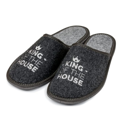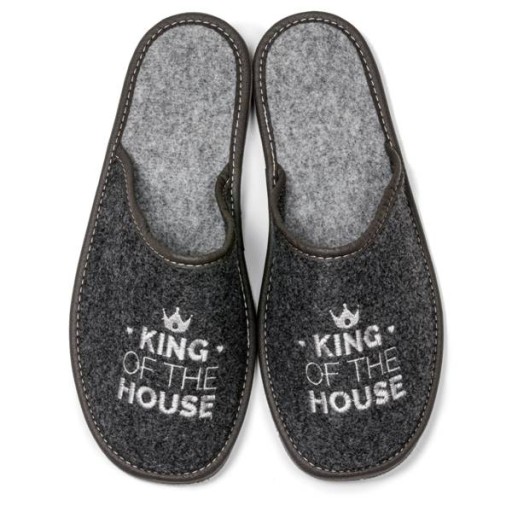 - Pantofle wykonane z ekologicznego filcu z haftowanym napisem na przodzie: KING OF THE HOUSE,