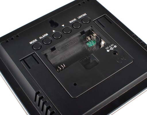 Stacja jest zasilana dwoma bateriami AAA (brak w zestawie) lub przez zasilacz sieciowy (w komplecie). Zasilana bateriami automatycznie wygasza ekran, który można podświetlić na kilka sekund przyciskiem LIGHT/SNZ na tylnym panelu. Zasilana sieciowo, świeci pełną mocą.
