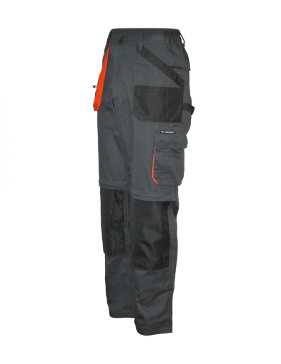 - Spodnie robocze-ochronne w kolorze grafitowym, niebrudzącym wraz z estetycznymi pomarańczowymi wstawkami w kieszeniach przestrzennych.