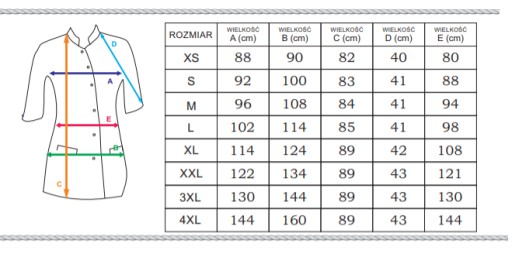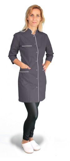 Rękaw ma długość ¾, natomiast cały fartuch sięga do połowy uda.