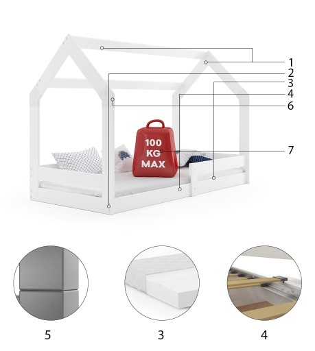- Materac : wymiar 160x80x7 + pokrowiec( pikowana tkanina hypoalergiczna wykonana z poliestru + włókno klimatyzujące + pianka poliuretanowa + zamek błyskawiczny).