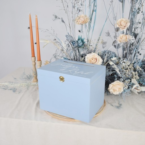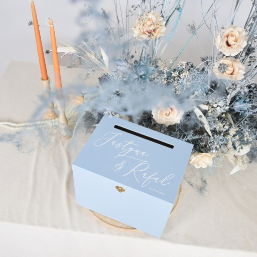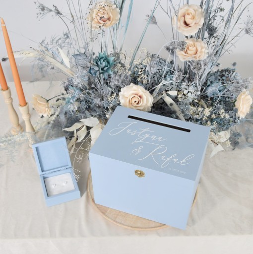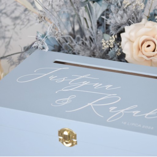Kuferek na koperty to nieodłączny element każdego wesela. Szczególną wartość ma jednak ta, która jest przypisana danej parze, ma subtelny nadruk i napis. Dzięki swojej pojemności w przyszłości znajdzie praktyczne zastosowanie przy przechowywaniu pamiątek rodzinnych