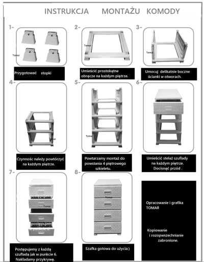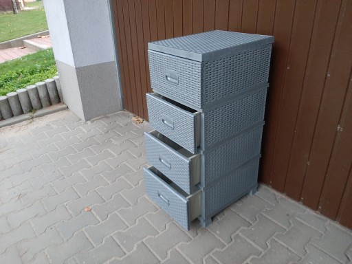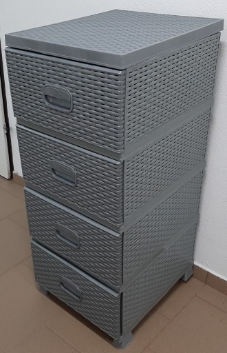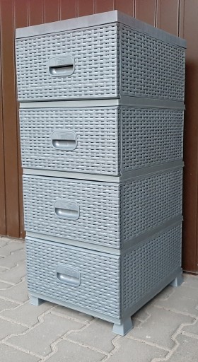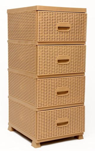 Komoda wykonana z wysokiej jakości tworzywa sztucznego o wzorze RATTANU,- Solidny i łatwy w utrzymaniu czystości,- Posiada 4 szuflady z blokadą zabezpieczającą przed wypadnięciem,- Produkt europejski,- Doskonale pasuje do salonu, kuchni, łazienki oraz pokoju dziecięcego. - Produkt łatwy w montażu, bez użycia jakichkolwiek narzędzi.