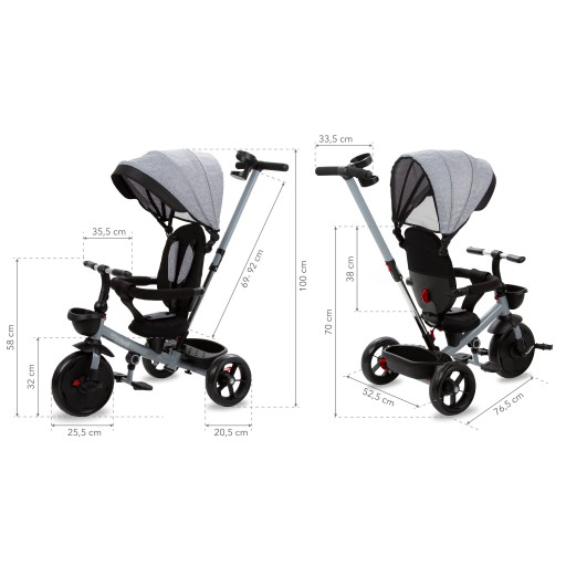 Posiada funkcję obrotu wokół własnej osi, a więc dziecko może siedzieć przodem, bądź tyłem do kierunku jazdy. Siedzisko pokryte jest antypoślizgowym pokrowcem, co unieruchamia i zabezpiecza przed zsuwaniem się dziecka podczas jazdy.