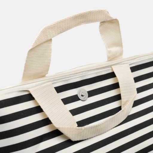 Piękna i praktyczna beżowo-czarna torba plażowa w paski - miej na plaży i w plenerze najpotrzebniejsze rzeczy zawsze pod ręką.