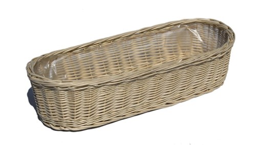 Starannie wykonane podłużne korytko z białej wikliny. Kosz jest wypleciony gęsto, starannie i solidnie- z dużym naciskiem na trwałość użytkowania. Pięknie zakończony podwójnym splotem dekoracyjnym. Do wyplotu użyto wyłącznie naturalnego materiału, pozbawionego szkodliwej chemii jakim jest wiklina. Jest to doskonała alternatywa dla plastikowych osłonek czy doniczek.