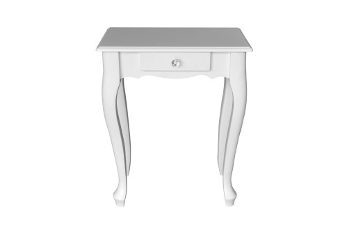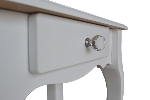 Rama, szuflada oraz nogi to lite drewno bukowe, blat wykonany z twardej płyty MDF, całość bejcowana i lakierowana lakierem termoutwardzalnym. Uchwyt kryształowy. Blat i skrzynia frezowana przez co wygląd wpasuje się w styl prowansalski.