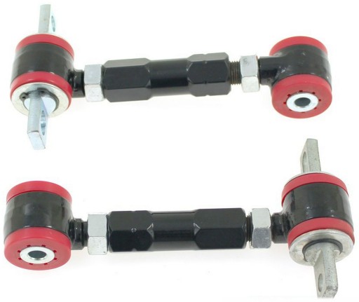 Komplet 2 szt. tylnych górnych wahaczy. Produkt szczególnie zalecany w przypadku obniżenia samochodu, kiedy koła tracą swoje fabryczne kąty. Dzięki regulacji wahacza można je idealnie ustawić.