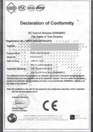 Maska posiada AKTUALNY ATEST PZH oraz DEKLARACJĘ ZGODNOŚCI Z NORMAMI EN i CERTYFIKAT CE