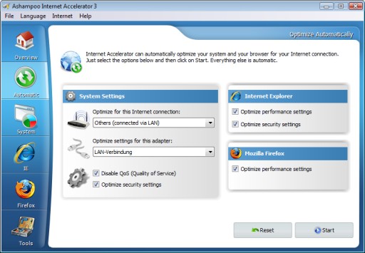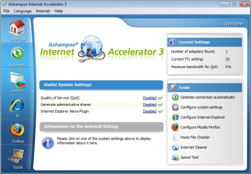 Ashampoo Internet Accelerator analizuje Twój komputer i optymalizuje wszystkie właściwe ustawienia w jednym kroku. Nie musisz mieć żadnej wiedzy, po prostu wybierasz automatyczną optymalizację i gotowe. Nowa wersja wprowadziła teraz narzędzie testujące prędkość połączenia Internetowego, tak więc możesz bezpośrednio sprawdzić wydajność Twojego łącza.