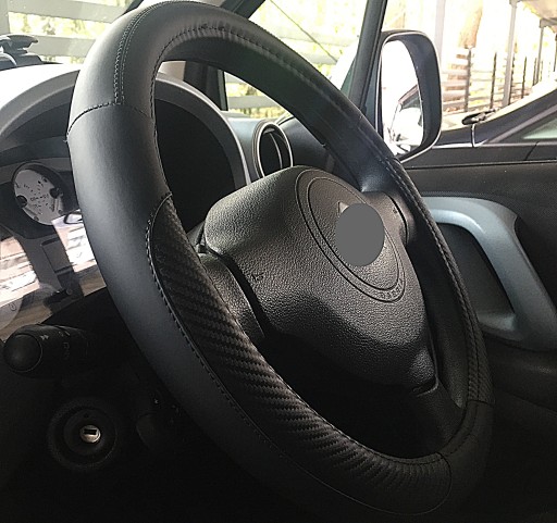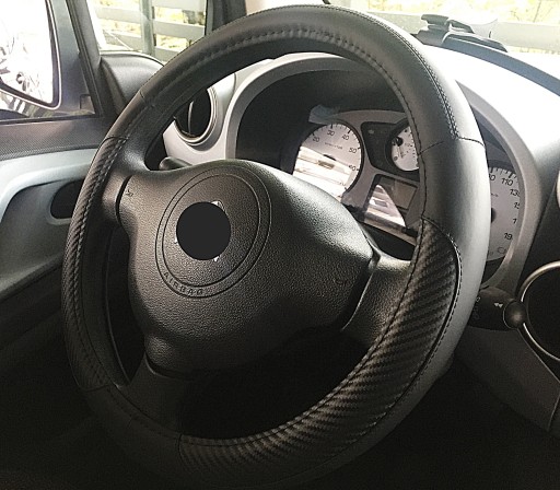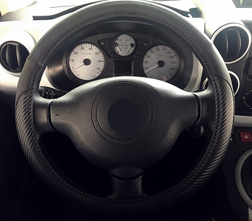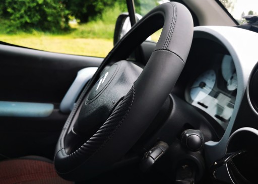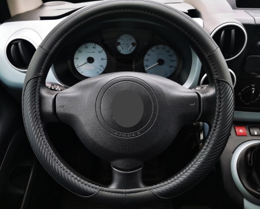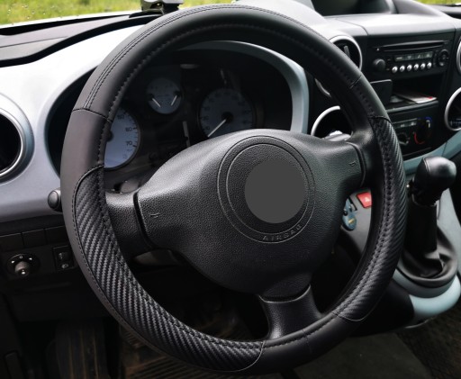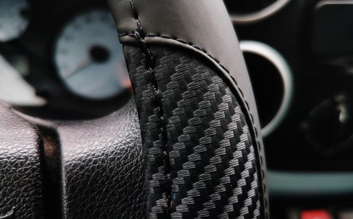 Pokrowiec na kierownicę z wysokiej jakości materiałów (ekoskóra połączona z imitacją karbonu).