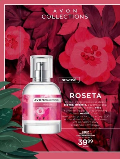 Witaj w świecie Avon Collections – najnowszej linii zapachowej, w której kwiaty mają moc! Nasza Roseta czaruje zmysły zatopioną w sercu różą i płomienną bazą, przyprawioną ciepłymi nutami wanilii. To nowoczesna kompozycja z akcentem retro, który podkreśla jej pełen elegancji, nonszalancki charakter.