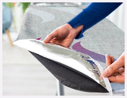 Total Reflect to jedyny pokrowiec z 100% warstwą metaliczną, całkowicie odbijającą parę. Technologia ta zapobiega skraplaniu się pary pod deską jak i przyspiesza prasowanie. Już jednostronne prasowanie pozwala na osiągniecie satysfakcjonującego efektu.