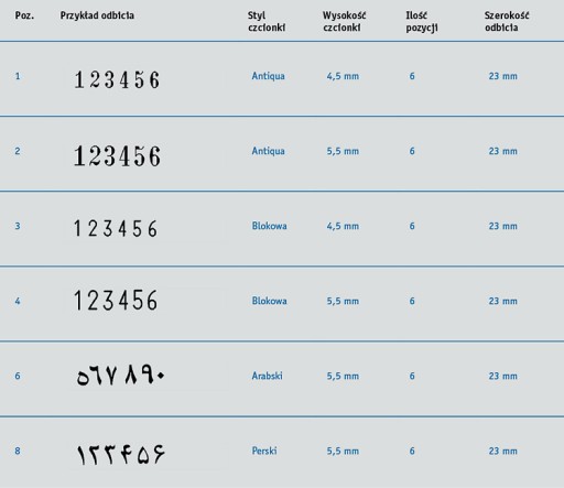 Automatyczny numerator sześciopozycyjny Horray w ekonomicznej, lekkiej obudowie z tworzywa. Styl czcionki: Antique. Automatyczne powtórzenia pozwalają wielokrotnie wykonać daną konfigurację odbicia co w znacznym stopniu podnosi wydajność pracy. Automatyczne powtórzenia dla modelu H57: 0x, 1x-6x, 12x, 20x.