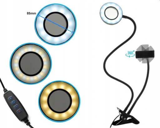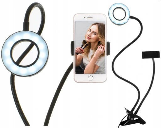 LAMPA PIERŚCIENIOWA LED Z UCHWYTEM SELFIE NA SMARTFONA Z KLAMRĄ