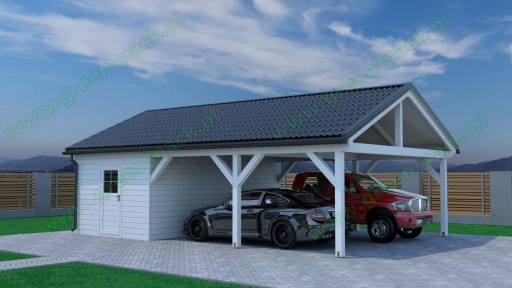 Bianco to solidna i stylowa wiata garażowa z przeznaczeniem na dwa auta. Wiata wraz z pomieszczeniem gospodarczym
