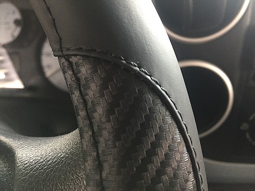 Pokrowiec na kierownicę z wysokiej jakości materiałów (ekoskóra połączona z imitacją karbonu).