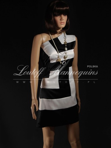 Elegancki manekin damski wraz z peruką, wykonany z tworzywa sztucznego idealnie odwzorowujący szczegóły i detale kobiecej sylwetki wzmocniony nadającym trwałość i odporność podczas eksploatowania.