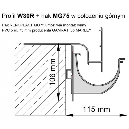 Uchwyty MG75 przeznaczony jest do montażu w profilach okapowych firmy Renoplast w modelach: K40, K60, W30R.