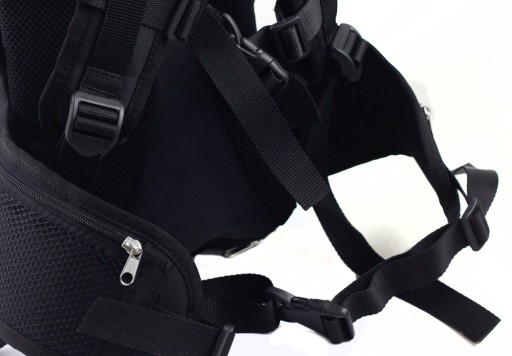 Plecak został wyposażony w regulowany pas piersiowy oraz biodrowy spinane na zatrzaski, profilowane szelki oraz delikatnie usztywnione plecy.