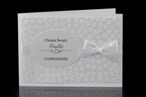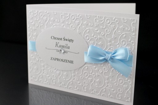 Proste i eleganckie Zaproszenie na Chrzest. Wymiary zaproszenia po złożeniu to 10,4 cm x 14,8 cm, Zaproszenie otwierane do boku. Wykonane z białego papieru o gramaturze 250gm2 przyozdobione tłoczeniem oraz wstążką - w zależności od wersji: białą, kremową, różową lub niebieską oraz cekinem. Sama treść zaproszenia może być dowolna.