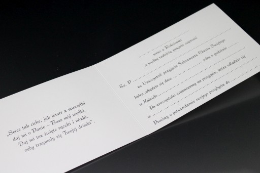 W środku wydrukowany jest tekst zaproszenia - możecie Państwo wybrać nasz tekst lub też zaproponować swój. Na zaproszeniu możliwe jest także dodanie zaproponowanego przez Państwa cytatu lub wierszyka.