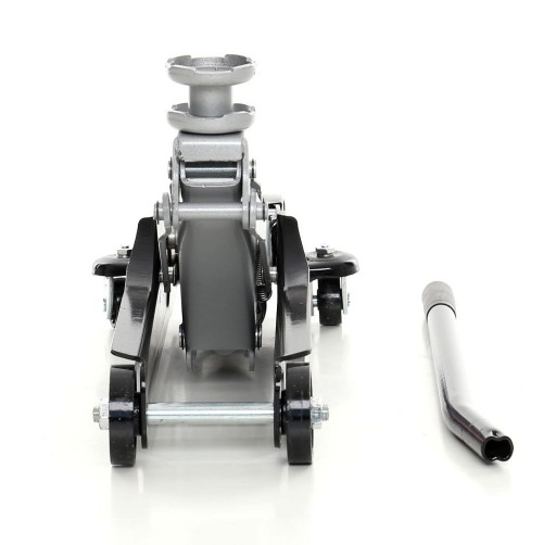 Podnośnik posiada solidne metalowe kółka pozwalające na precyzyjne umieszczenie pod autem oraz składaną dźwignię.