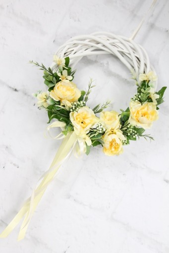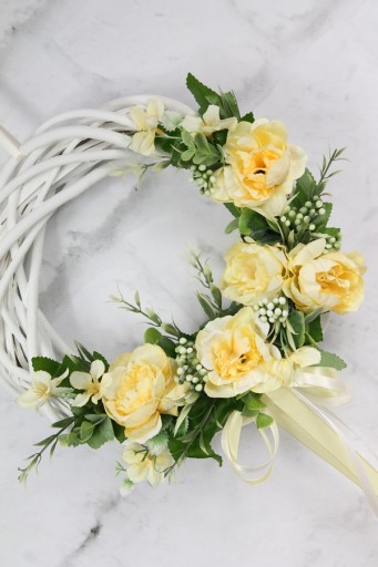 Wianek wiklinowy wybielany o średnicy 25cm udekorowany kwiatami peoni i jaśminu w odcieniu słonecznego beżu.