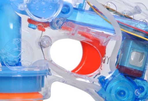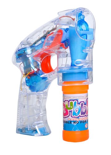 Pistolet do baniek mydlanych posiada kolorowe światełka, które uatrakcyjnią zabawę szczególnie wieczorem. Najpierw włóż baterie, następnie wkręć płyn do baniek do pistoletu. Aby włączyć pistolet wystarczy wcisnąć przycisk przy uchwycie. Gdy skończy się płyn, możesz go uzupełnić własnym (np. mieszając płyn do naczyń z wodą).