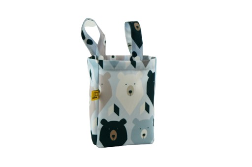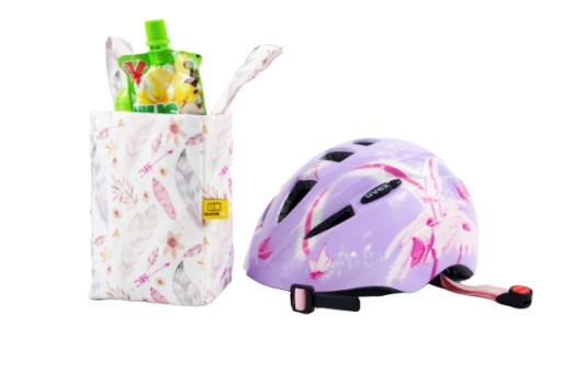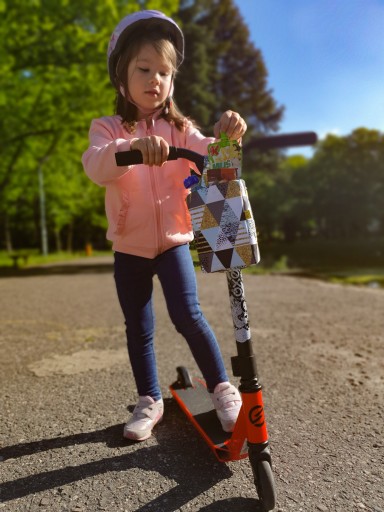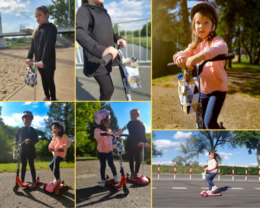 Rączki torebeczki zostały zaprojektowanie, tak aby umożliwić szybkie zamocowanie na kierownicy hulajnogi, dostawki oraz innych pojazdach.