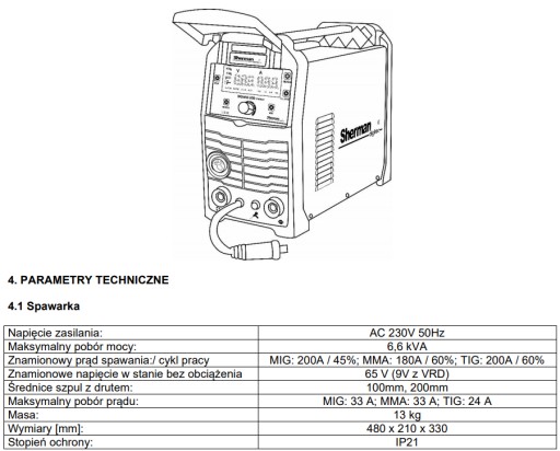 - Spawarka SHERMAN DIGIMIG 200 SYNERGIC wraz z przewodem zasilającym z wtyczką