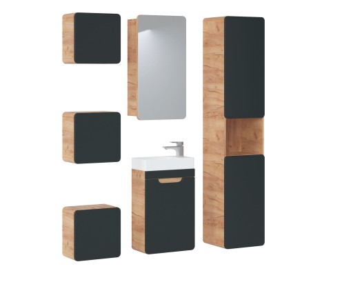 Aruba to niezwykła kolekcja, która zachwyca lekkim i nowoczesnym designem. Korpusy w kolorze drewna w połączeniu z czarnymi frontami tworzą delikatną całość w klimacie tropikalnego SPA. Zaokrąglone kanty wszystkich szafek dodają kolekcji niebanalnego charakteru i lekkości, a fronty bez uchwytów nawiązują do najnowszych trendów wnętrzarskich. Kolekcja składa się z niskich i wysokich szafek w różnych wariantach, co pozwala na skomponowanie indywidualnego i niepowtarzalnego zestawu. Niewątpliwie ciekawym i niezwykle modnym rozwiązaniem jest szafka pod umywalkę nakładaną. Doskonałym dopełnieniem serii jest lustro z podświetleniem LED, które nadaje całej serii nowoczesnego charakteru. Kolekcja Aruba przypadnie do gustu wszystkim, którzy szukają niebanalnych i nowoczesnych rozwiązań do swojej łazienki.