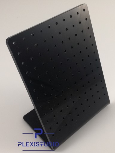 Bardzo elegancki stojak na kolczyki z plexi. W stojaku wycięte są otworki w celu wygodnego wieszania różnych modeli kolczyków.