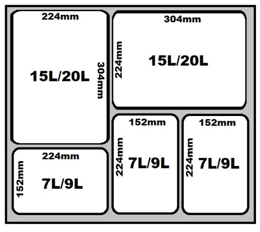 Skomponuj własny zestaw koszy do szafki lub szuflady o szer. 45 cm, 50 cm, 60 cm, 80 cm, 90 cm, głębokości 50 cm - wg poniższego schematu.
